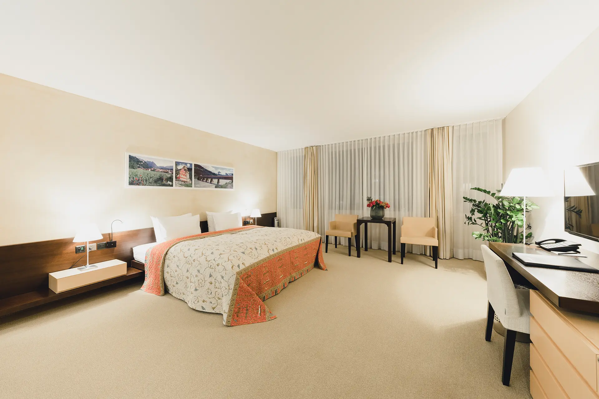 Unsere 40 m² großen Familienzimmer bieten den idealen Rahmen für einen entspannten Aufenthalt mit Ihrer Familie oder Gruppe. Geniessen Sie den Blick auf die lebendige Innenstadt und die beeindruckenden Schweizer Berge direkt von Ihrem Zimmer aus.